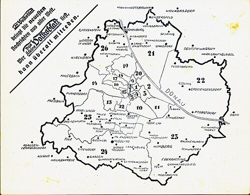| Informationsblatt über die Neugestaltung der Grenzen von Wien 1938, grafische Angaben über die Veränderungen zu Groß Wien, Grenzen der neuen Bezirke | alter Informationsbeleg auf Basis der amtlichen Unterlagen, für die Datei: Eigenes Werk | unbekannt, für die Datei: Josef Moser | Datei:Groß Wien Taschenkarte Bezirksgrenzen 1938.jpg | |