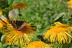 | Große Telekie Telekia speciosa mit Kleiner Fuchs, Blüten sind ein Magnet für Insekten | Eigenes Werk | Caronna | Datei:Große Telekie Telekia speciosa mit Falter.jpg | |