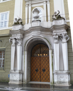 Das Marmorportal an der nordseitigen Fassade zum Herbert-von-Karajan-Platz ist eine Arbeit des Barockarchitekten Johann Bernhard Fischer von Erlach. Es wurde auch aus der Kriegsbeute des Türkenkriegs von 1683 finanziert, bei dem Salzburg zum Entsatz der Türkenbelagerung von Wien 800 Mann (aber auch hohe Geldmittel für Munition) entsandt hatte und 1688 auch an der Eroberung Belgrads unter Prinz Eugen von Savoyen teilgenommen hatte.[5] Die Frauenfiguren auf dem Portal stellen Europa und Asia dar; dass sie auf Einhörnern sitzen, ist erst seit der letzten Renovierung bekannt. Eine weitere Besonderheit dieses Tores ist ein Lichtdurchbruch nach oben, durch den Licht auf die Häupter der zur Pferdeschwemme gebrachten Pferde fallen konnte.