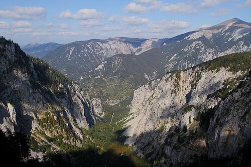 | Blick vom Alpenvereinssteig in Richtung Talausgang des Großen Höllentals . Im Hintergrund das Schneebergmassiv mit dem Klosterwappen - Niederösterreichs höchster Gipfel. | Eigenes Werk | C.Stadler/Bwag | Datei:Großes Höllental.JPG | |