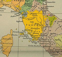 | Italy at the end of the 16th century. | This image is a copy or a derivative work of italy_16_century.jpg , from the map collection of the Perry–Castañeda Library (PCL) of the University of Texas at Austin . This tag does not indicate the copyright status of the attached work. A normal copyright tag is still required. See Commons:Licensing for more information. "The Cambridge Modern History Atlas" edited by Sir Adolphus William Ward, G.W. Prothero, Sir Stanley Mordaunt Leathes, and E.A. Benians. Cambridge University Press; London. 1912. | Datei:GrhToscane.jpg |