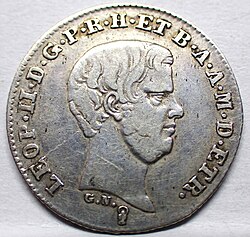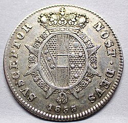 Der im April 1814 wiedereingesetzte habsburgische Großherzog Ferdinand III. rächte sich an den zahlreichen Kollaborateuren in Adel und Bürgertum nicht, sondern betrieb erneut eine gemäßigte liberalkonservative Politik, die sich vorteilhaft von der Reaktion in zahlreichen Nachbarstaaten Italiens abhob. Dieser Linie blieb auch sein Sohn und Nachfolger Leopold II. (1824–1859) treu. In den 1820er Jahren war Toskana ein wichtiges intellektuelles Zentrum Italiens und damit auch ein gemäßigt-oppositionelles Sammelbecken. Im Jahr 1825 wurde das Münzsystem teilweise auf das Dezimalsystem umgestellt: 100 Quattrini galten nun 1 Fiorino, zehn Paoli galten vier Fiorini.[19] Auch an der liberalen Reformpolitik der Jahre 1847/48 beteiligte sich der Großherzog – sehr zum Unwillen der Wiener Regierung. Die radikale Revolution von 1849, welche die Monarchie zeitweilig abschaffte und den Herrscher in die österreichischen Arme trieb, änderte dies grundlegend. In den letzten zehn Jahren seiner Regierung war Leopold allein schon durch eine starke österreichische Militärbesatzung strikt der Politik seines kaiserlichen Verwandten Franz Joseph I. unterworfen.