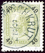 | KK 40 heller, olivgrün und schwarz, ohne Lackstreifen, gez. 13;12². Michel N°78A. | Eigenes Werk | Jacquesverlaeken | Datei:1901 KK 40h Böhmischkrut Mi78A.jpg | |