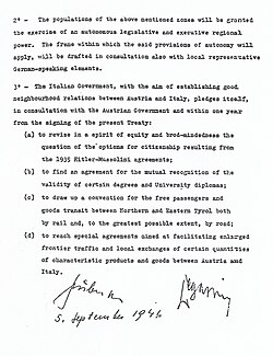 Auf italienischer Seite verhandelte Alcide De Gasperi, der damals provisorisches Oberhaupt Italiens war, nicht selbst, sondern sandte den italienischen Botschafter in Großbritannien, Nicolo Carandini, als Unterhändler nach Paris. Im Rahmen der Verhandlungen strebte der österreichische Außenminister Karl Gruber zunächst eine Angliederung Südtirols an Österreich an. Der italienische Ministerpräsident Alcide De Gasperi rückte vom territorialen Anspruch Italiens auf das Gebiet jedoch nicht ab und beeinflusste durch geschickte Diplomatie auch die Siegermächte. So hatte er unter anderem in einem Interview mit der New York Times nahegelegt, die Einwohner Südtirols seien unwissende Bauern, die überwiegend italienischer Herkunft seien und sich nur aus Angst vor einer Rückkehr der Deutschen nicht als Italiener bekannten.[2] Auf Drängen der Siegermächte stellte De Gasperi eine Autonomie für die Region Trentino-Südtirol in Aussicht. Gruber willigte in den Vorschlag De Gasperis trotz Vorbehalten ein, wobei speziell das Vereinigte Königreich auf eine Einigung gedrängt hatte.