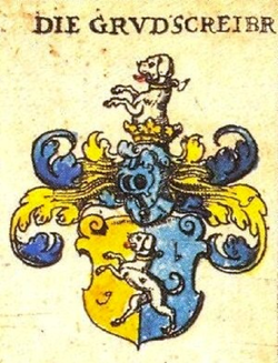 | Wappen der Gruttschreiber, schlesisches Adelsgeschlecht. | Johann Siebmachers Wappenbuch, Nürnberg 1605, Tafel 72 (Ritterschaft und Adel in Schlesien) | Autor/-in unbekannt Unknown author | Datei:Gruttschreiber-Wappen.png | |