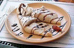 | Patschinke (fotografiert in Bratislava), gefüllt mit verschiedenen Marmeladen oder Nuss, wie sie in Österreich, Tschechien, in der Slowakei oder in Ungarn serviert wird | Eigenes Werk | User:Karl Gruber/Credits | Datei:Palatschinke.jpg |