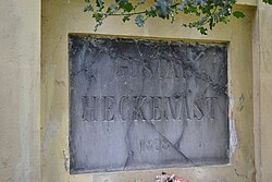 | Náhrobná tabuľa nad hrobom Gustava (Gusztava) Hackenasta (1811 - 1878) na múre kaplnky. G. Hackenast bol známy kníhkupec a vydavateľ, veľký popularizátor literatúry. V roku 1873 si dal postaviť impozantný palác na nároží Konventnej a Kozej ulice | Eigenes Werk | Lure | Datei:Cintorín pri Kozej bráne Hackenast 01.jpg | |
