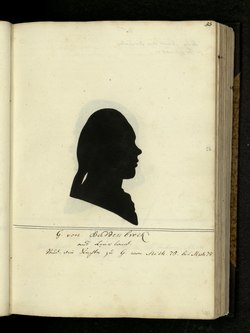 | Schattenriss Porträt des stud. G. von Buddenbrock, 1777 Senior der Landsmannschaft der Kurländer und Mitglied des Studentenordens ZN, in der de:Silhouetten-Sammlung Schubert , Handschriften Abteilung der SUB Göttingen. | Scan GDZ | Carl Schubert | Datei:55GvBuddenbrock128.tif |