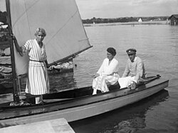 Gustav Meyrink mit seiner Frau und Tochter in einem Segelboot auf dem Starnberger See. Veröffentlicht in Die Dame 16/1923 | 1 ( 2 ) | Ludwig Boedecker | Datei:Gustav Meyrink 1923 by Ludwig Boedecker.jpg | |
