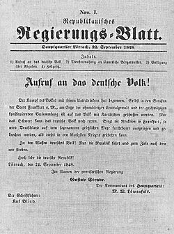 | Republikanisches Regierungsblatt Nr. 1 | Gerhard Moehring: Kleine Geschichte der Stadt Lörrach, Seite 78 | selbst gescannt | Datei:Regierungsblatt 1848.JPG | |