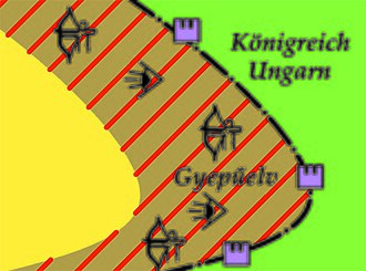 Das westungarische Grenzschutzgebiet wurde nach der Niederlage der Ungarn gegen den König des Ostfrankenreiches Otto I. den Großen in der Schlacht auf dem Lechfeld 955 ausgebaut.[2] Der Gyepű diente in dieser Region dem Schutz vor Einfällen durch die Deutschen vom Westen her. Die Ungarn siedelten Wächter in der Region an. Die Gyepűzone entlang der Landesgrenze zum Ostfrankenreich war zweifach gegliedert. Die innerste Linie bildete eine Burgenkette von Karlburg über Eisenburg nach Süden. Diese Verteidigungslinie wurde mit Wällen und Pfählen befestigt. Nur an den wichtigsten Ein- und Ausfallstraßen gab es schmale Durchlässe, die sogenannten „Portae regni“, die gesondert befestigt waren. Die äußerste Linie war das Grenzödland im Westen mit ungangbar gemachten Wäldern, Sümpfen und Überschwemmungsgebieten, das sich zwischen Muraszombat im heutigen Slowenien und Regede in der heutigen Steiermark erstreckte.[3] Ein großer Teil des heutigen Burgenlandes in Österreich lag in der Gyepűelve.[4]