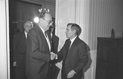 | Es folgt die historische Originalbeschreibung , die das Bundesarchiv aus dokumentarischen Gründen übernommen hat. Diese kann allerdings fehlerhaft, tendenziös, überholt oder politisch extrem sein. Bundesminister Genscher in Ungarn 23. - 24. November 1989 | Dieses Bild wurde im Rahmen einer Kooperation zwischen dem deutschen Bundesarchiv und Wikimedia Deutschland aus dem deutschen Bundesarchiv für Wikimedia Commons zur Verfügung gestellt. Das deutsche Bundesarchiv gewährleistet eine authentische Bildüberlieferung nur durch die Originale (Negative und/oder Positive), bzw. die Digitalisate der Originale im Rahmen des Digitalen Bildarchivs . | Autor/-in unbekannt Unknown author | Datei:Bundesarchiv B 145 Bild-F083119-0006, Ungarn, Besuch Außenminister Genscher in Ungarn.jpg | |