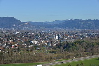 | Ortsbild von Höchst (Vorarlberg) . Im Hintergrund das Gebirgsmassiv des Pfänderstocks . Die schneebedeckten Berge gehören der Nagelfluhkette an. In der Bildmitte vor und hinter der Pfarrkirche, sowie am rechten Bildrand die Werke 1,2,(5 Fußach ) und 3 von Julius Blum GmbH . In der Front verläuft auf Schweizer Gebiet die Autobahn A1 . | Eigenes Werk | Feel free to use my photos, but please mention me as the author and if you want send me a message . or ( rufre@lenz-nenning.at ) | Datei:Höchst, Vorarlberg 5.JPG | |