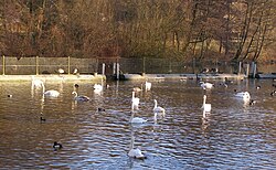 | Das Schwanen-Überwinterungsgehege im Eppendorfer Mühlenteich am 2. Weihnachtstag 2008. Vögel innerhalb der Umzäunung: Höckerschwäne ( Cygnus olor ) im Jugend- und Adultkleid, Kanadagänse ( Branta canadensis ) und Reiherenten ( Aythya fuligula ) | Eigenes Werk | Olaf Studt ( Hämbörger ) | Datei:Eppendorfer Muehlenteich Schwaene 2008-12-26.jpg | |