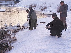 | People feeding swans and ducks on Jeziorka river bank in Konstancin-Jeziorna, Poland. Ejdzej is the one with rucksack and large bag of bread. | Eigenes Werk | Iric | Datei:Feeding Swans in Jeziorka-Iric-2006.jpg | |