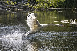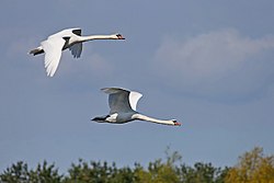 | Gruppe von Höckerschwänen ( Cygnus olor ) im Flug. Aufgenommen in den Salzmarschen in der Lagune von Venedig , Italien | Eigenes Werk | Pjt56 --- If you use the picture outside Wikipedia I would appreciate a short e-mail to pjt56@gmx.net or a message on my discussion page | Datei:Cygnus olor-pjt2.jpg | |