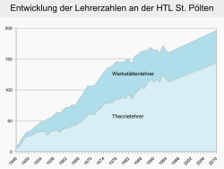 | Anzahl der Lehrer an der HTL St. Pölten 1946 - 2010. Die Zahlen 1946-1996 entstammen dem Buch 50 Jahre Bundesgewerbeschule und Höhere technische Lehranstalt St. Pölten , 2010 von der Schulhomepage. Dazwischen sind sie interpoliert | Eigenes Werk | Alexander Wagner | Datei:Lehrer an der HTL St. Pölten.svg | |