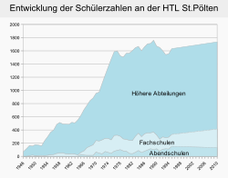 | Anzahl der Schüler an der HTL St. Pölten 1946 - 2010. Die Zahlen 1946-1996 entstammen dem Buch 50 Jahre Bundesgewerbeschule und Höhere technische Lehranstalt St. Pölten , 2010 persönlicher Nachfrage. Dazwischen sind sie interpoliert | Eigenes Werk | Alexander Wagner | Datei:Schüler an der HTL St. Pölten.svg | |