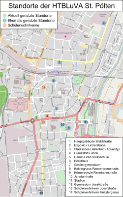 | Karte der Standorte der HTL St. Pölten | Eigenes Werk , Grundkarte von openstreetmap.org | OpenStreetMap und Mitwirkende (Karte), Alexander Wagner (Markierungen und Legende) | Datei:Standorte der HTL St. Pölten.svg |