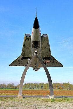| Das Schauobjekt Abfangjäger Saab-Draken an der Kreuzung Kasernenstraße/Salzburgerstraße (B1) in der oberösterreichischen Markgemeinde Hörsching . Das Schauobjekt ist eine Saab Draken J 35D (J 35OE) mit der Seriennummer 35-340 (Serialnummer 35-1411). Das Flugzeug wurde um 1965 gefertigt, am 14. Okt. 1988 dem Österreichischen Bundesheer überstellt und im April 2005 ausgemustert. Im Februar 2007 wurde es mittels Tieflader von Zeltweg nach Hörsching transportiert und im Zuge des Baues der Umfahrung Neubau 2009/2010 zwischen der Zufahrtsstraße zum Fliegerhorst Vogler und der B1 aufgestellt. | Eigenes Werk | C.Stadler/Bwag | Datei:Hörsching - Schauobjekt Saab Draken.JPG | |