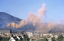 | Blick auf das Stahlwerk im de:Hüttenwerk_Donawitz der damaligen de:Österreichisch-Alpine Montangesellschaft (heute de:voestalpine ) im Jahr 1955. Leoben, Steiermark, Österreich | Nachlass Walter Kropf | Walter Kropf | Datei:1955-10-01 02 Eisenoxydwolke des Blasstahlwerkes über Donawitz vom Gigerlwirt.jpg | |