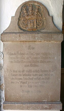 | Grabdenkmal Johann Nepomuk von Hackledt (+ 1799) in der Pfarrkirche von Sankt Marienkirchen bei Schärding. Eine wissenschaftliche Bearbeitung liegt vor in SEDDON Christopher R., Die inschriftlichen Denkmäler der Herren und Freiherren von Hackledt. Grablegen, Memoria und Repräsentation eines Innviertler Landadelsgeschlechtes, Wien (Dipl. Arb.) 2002 , S. 207-209. | Eigenes Werk | PicturePrince | Datei:Johann Nepomuk von Hackledt.JPG | |