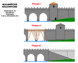 | Befundskizze des östlichen Widerlagers der römischen Brücke am Hadrianswall bei Willowford (GB), 2. bis 3. Jahrhundert n.Chr. | Eigenes Werk ( Originaltext: eigene Arbeit ) | Veleius | Datei:BS Wallbrücke Willowford.png | |