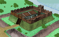 | Rekonstruktionsversuch des Westtors von Kastell Aesica, Hadrianswall (GB), Zustand im 4. Jahrhundert n. Chr. Blick von Nordwest. | Eigenes Werk | Veleius | Datei:Aesica Westtor 4. Jahrhundert n.Chr..png | |