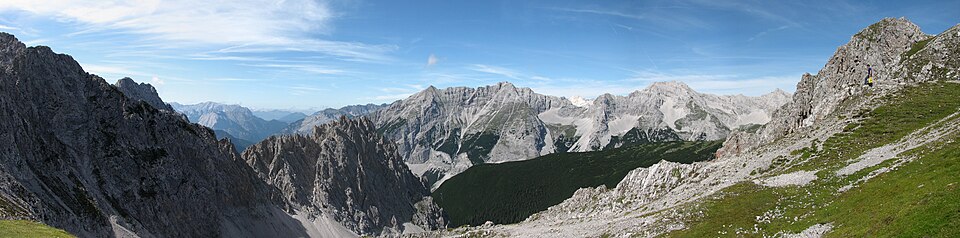 Panorama-Ansicht vom Hafelekar bei Innsbruck in Richtung Norden | Eigenes Werk | Nudelbraut | Datei:PanoramaView Hafelekar.jpg |