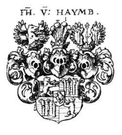 - Benedict (Benusch) Haym oder Haimb, Obrister, zuletzt Feldherr des Kaisers Ludwig IV., Herzogs von Bayern und Pfalz, erhielt im Jahre 1345 ein Wappen. Er lebte noch 1350, seine Söhne Johann und Andreas Haim (Haymer) lebten 1367 und 1389 in Bayern zu Landshut. Ritter Heinrich Haymer, Sohn des Johann, zog in die Steyermark und wird dort 1400 und 1411 genannt.