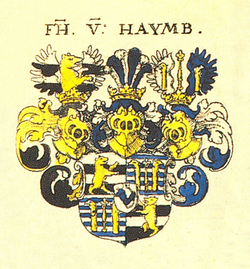 | Wappen der Freiherren von Haim (Haymb) | Siebmachers Wappenbuch, Teil 1 | Johann Siebmacher | Datei:COA Haymb FH col.png | |