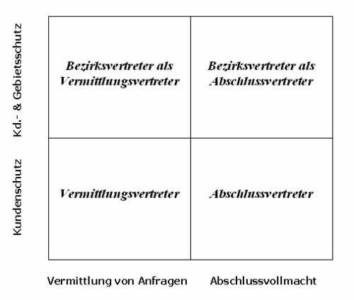 Hat der Handelsvertreter vom Unternehmer Handlungsvollmacht, Willenserklärungen (Abgabe und Annahme von Vertragsangeboten) in dessen Namen abzugeben, ist er Abschlussvertreter. Besteht diese Vollmacht nicht, ist der Handelsvertreter ein Vermittlungsvertreter. In letzterem Fall kann der Unternehmer die durch den Vermittlungsvertreter vermittelte Kundenanfrage ablehnen (z. B. wenn der Kunden nicht solvent ist oder der Unternehmer nicht lieferfähig), so dass der Provisionsanspruch nicht entsteht. Der Vermittlungsvertreter tritt hier in der Regel als Bote der Willenserklärung zwischen den zu vermittelnden Parteien auf.