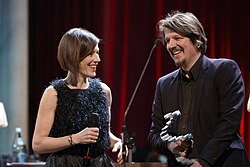 | Pia Hierzegger , Moderatorin der Verleihung des Österreichischen Filmpreises 2017 , mit Hannes Salat , ausgezeichnet für des beste Szenenbild ( Stille Reserven ); Festsaal des Rathauses in Wien , Österreich . | Eigenes Werk | Manfred Werner (Tsui) | Datei:Österreichischer Filmpreis 2017 Preisverleihung20 Stille Reserven Hannes Salat Pia Hierzegger.jpg |