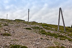 | Reste der Telegrafenleitung, die 1882 zum Rainer Schutzhaus am Hochobir (Karawanken, Kärnten) errichtet wurde, um die meteorologischen Messwerte ins Tal übermitteln zu können. | Eigenes Werk | H. Raab ( User:Vesta ) | Datei:Hochobir Telegraph Line.jpg | |