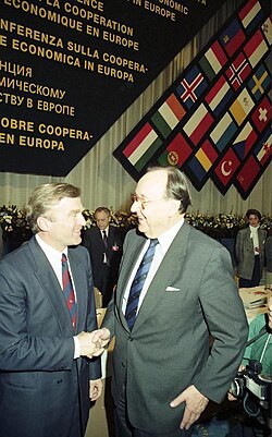 | Es folgt die historische Originalbeschreibung , die das Bundesarchiv aus dokumentarischen Gründen übernommen hat. Diese kann allerdings fehlerhaft, tendenziös, überholt oder politisch extrem sein. Am 19.3.1990 wurde im Bonner Hotel- und Kongreßzentrum "Maritim" die erste Wirtschaftskonferenz der 35 Unterzeichnerstaaten der Schlußakte von Helsinki über Sicherheit und Zusammenarbeit in Europa (KSZE) eröffnet, die bis zum 11.4.1990 dauern wird. | Dieses Bild wurde im Rahmen einer Kooperation zwischen dem deutschen Bundesarchiv und Wikimedia Deutschland aus dem deutschen Bundesarchiv für Wikimedia Commons zur Verfügung gestellt. Das deutsche Bundesarchiv gewährleistet eine authentische Bildüberlieferung nur durch die Originale (Negative und/oder Positive), bzw. die Digitalisate der Originale im Rahmen des Digitalen Bildarchivs . | Engelbert Reineke | Datei:Bundesarchiv B 145 Bild-F083855-0012, Bonn, Wirtschaftskonferenz der KSZE-Staaten.jpg | |