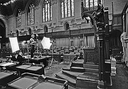 | Hans-Ludwig Blohm on the speaker’s table in the Canadian House of Commons to take detailed large format photographs for Public Works Canada, prior to changes to the House for the accomodation of more members of parliament (MPs). | received from the author | Hans Blohm | Datei:Hans Blohm Canadian House of Commons.jpg | |