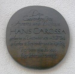 Hans Carossa (* 15. Dezember 1878 in Tölz; † 12. September 1956 in Rittsteig bei Passau) war ein deutscher Schriftsteller (Lyrik und Erzählungen) und Arzt. Seine Arztpraxis gab er schließlich auf, um sich ganz seiner literarischen Betätigung widmen zu können.