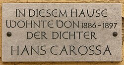 | München, Gedenktafel für Hans Carossa in der Türkenstraße / Ecke Theresienstraße | Selbst fotografiert | Photo: Andreas Praefcke | Datei:München Tafel Carossa.jpg | |