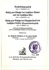 | de:Wilhelm Stuckart , de:Hans Globke : de:Reichsbürgergesetz vom 15. September 1935. s:de:Gesetz zum Schutze des deutschen Blutes und der deutschen Ehre vom 15. September 1935; de:Gesetz zum Schutze der Erbgesundheit des deutschen Volkes vom 18. Oktober 1935; Nebst allen Ausführungsvorschriften und den einschlägigen Gesetzen und Verordnungen C.H. Beck, München 1936 | book | Wilhelm Stuckart; Hans Globke | Datei:Stuckart10.pdf |