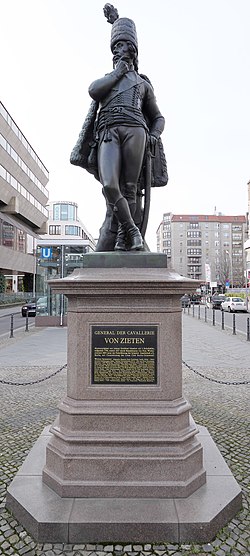 - Die Hans-Joachim-von-Zieten-Statue ließ Friedrich Wilhelm II. 1794 in Berlin auf dem Wilhelmplatz aufstellen. Die zunächst von Johann Gottfried Schadow geschaffene Marmorskulptur wurde 1857 durch den Bronzeguss von August Kiß ersetzt. Er steht heute auf dem nach ihm benannten Zietenplatz an der Ecke Wilhelmstraße/Mohrenstraße neben dem Denkmal Leopolds I. von Anhalt-Dessau, des „Alten Dessauers“.