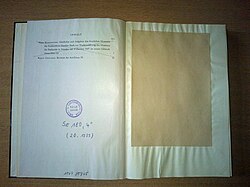| Artikel von Hans Kummerlöwe (1939): Geschichte und Aufgaben des Staatlichen Museums für Tierkunde in Dresden. Abh. & Ber. Staatl. Mus. Tierkunde & Völkerkunde 20 (N.F. Reihe A, 1): 1-15. Unbekannte haben den Titel im Inhaltverzeichnis durchgestrichen, entfernten die Seiten 1 bis 14 und überklebten Seite 15 (auf Seite 16 beginnt der nächste Artikel) in vielen Bibliotheken. Dieses Beispiel ist aus der Bibliothek nder Martin-Luther-Universität Halle (Saale), Deutschland. | Eigenes Werk | Gunther Tschuch PaulT | Datei:Paper Hans Kummerloewe 1929.jpg | |