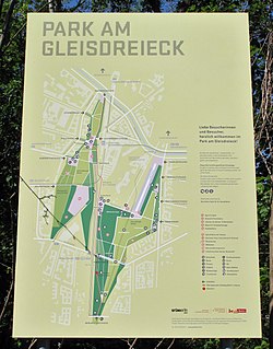 | Schautafel Karte Park am Gleisdreieck . Der Park am Gleisdreieck ist eine öffentliche Grün- und Erholungsanlage in Berlin-Kreuzberg und Berlin-Schöneberg . Der rund 31,5 Hektar umfassende Park liegt auf dem ehemaligen Gelände des Gleisdreiecks und entstand auf den Bahnbrachen des Anhalter und Potsdamer Güterbahnhofs . Die Trasse der Nord-Süd-Fernbahn teilt die Grünanlage in den Ostpark und den Westpark . Der Ostpark wurde am 2. September 2011, der Westpark am 31. Mai 2013 eröffnet. In südlicher Fortsetzung des Westparks wurde am 21. März 2014 der dritte Parkteil, der Flaschenhals oder Flaschenhalspark , der Öffentlichkeit übergeben. | Eigenes Werk | Lienhard Schulz (picture). Grün Berlin GmbH, Bezirksamt Tempelhof-Schöneberg, Senatsverwaltung für Stadtentwicklung und Umwelt (Information board/map). | Datei:Karte Park am Gleisdreieck 2014.jpg | |