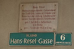 | Gedenktafel Hans Resel am Gebäude der steirischen Arbeiterkammer in der Hans-Resel-Gasse in Graz. | Eigenes Werk | TheRunnerUp | Datei:GrazHansReselGedenktafel.jpg |