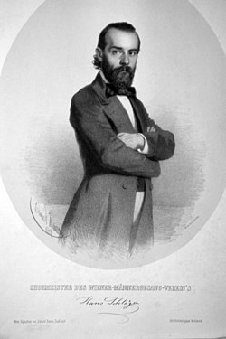 | Hans Schläger (1820-1885), Musiker, Komponist, Chorleiter, Dirigent. Lithographie von Eduard Kaiser, 1858 | Eigenes Foto einer Originallithographie der Albertina (Wien) | Eduard Kaiser (1820-1895) | Datei:Hans Schläger Litho.jpg | |