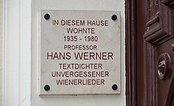 | Hans Werner (1898-1980) war ein österreichischer Wienerliedtexter. | Eigenes Werk | Herzi Pinki | Datei:Plaque Hans Werner, Währinger Straße 68.jpg | |