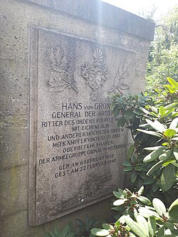 | Grabplakette für General der Artillerie Hans von Gronau. | Eigenes Werk | PantherStrix | Datei:Grabplakette Hans von Gronau.jpg | |
