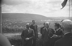 | Es folgt die historische Originalbeschreibung , die das Bundesarchiv aus dokumentarischen Gründen übernommen hat. Diese kann allerdings fehlerhaft, tendenziös, überholt oder politisch extrem sein. Ministerpräsidenten-Konferenz der Länder der 3 Westzonen Deutschlands auf dem Berghotel Rittersturz in Koblenz (v.l.n.r.: Wilhelm Kaisen, Dr. Hans Haberer, Karl Friedrich Zörgiebel) 8.-10.7.1948 | Dieses Bild wurde im Rahmen einer Kooperation zwischen dem deutschen Bundesarchiv und Wikimedia Deutschland aus dem deutschen Bundesarchiv für Wikimedia Commons zur Verfügung gestellt. Das deutsche Bundesarchiv gewährleistet eine authentische Bildüberlieferung nur durch die Originale (Negative und/oder Positive), bzw. die Digitalisate der Originale im Rahmen des Digitalen Bildarchivs . | Vollrath | Datei:Bundesarchiv B 145 Bild-F046121-0043, Koblenz, "Rittersturz-Konferenz", Kaisen, Haberer, Zörgiebel.jpg | |