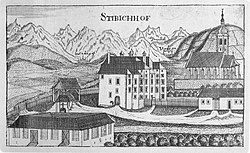 | G. M. Vischers Käyserlichen Geographi, Topographia Ducatus Stiriae, Das ist: Eigentliche Delineation / und Abbildung aller Städte / Schlösser / Marcktfleck / Lustgärten / Probsteyen / Stiffter / Clöster und Kirchen / so es sich im Herzogthumb Steyrmarck befinden; Und anjetzoUmb einen billichen Preyß zu finden seyndBey Johann Bitsch Universitäts Buchhandlern /Auff dem Juden=Platz bey der guldenen Saulen. Graz 1681 Die Nummerierung der Dateien folgt der alphabetischen Reihung der Ortsnamen und entspricht nicht dem Vischer-Register Dieses Bild zeigt das in Österreich unter der Nummer 36669 denkmalgeschützte Objekt. ( Commons , de , Wikidata ) Dieses Bild zeigt das in Österreich unter der Nummer 57749 denkmalgeschützte Objekt. ( Commons , de , Wikidata ) | Topographia Ducatus Stiriae | Georg Matthäus Vischer | Datei:Vischer - Topographia Ducatus Stiriae - 412 Stibichhofen bei Leoben.jpg |