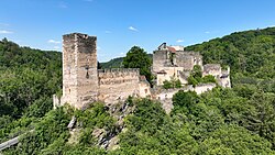 | Die röm.-kath. Stadtpfarrkirche hl. Veit in der niederösterreichischen Stadt Hardegg und rechts davor der Karner . Die Kirche besteht aus einem romanischen Langhaus , einem hochgotischen Chor (um 1400), sowie einem barocken Turm aus dem Jahr 1754 und wurde ab 1743 barockisiert. Der Karner, ein unverputztes, aus Bruchsteinen romanisches Rundbauwerk mit stumpfem Kegeldach, wurde in der Zeit zwischen 1150 und 1160 errichtete. | Eigenes Werk | C.Stadler/Bwag | Datei:Hardegg - Kirche und Karner.JPG | |