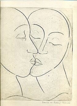 | Kaltnadelradierung "Liebespaar" von H. v. Rathlef-Keilmann, aus der Mappe "Die Schaffenden", hrsg. P. Westheim, 1932 | Kunstmappe "Die Schaffenden", Reckendorf-Verlag, Berlin 1932 | Harriet von Rathlef-Keilmann | Datei:Kaltnadelradierung Liebespaar Berlin 1932.jpg |